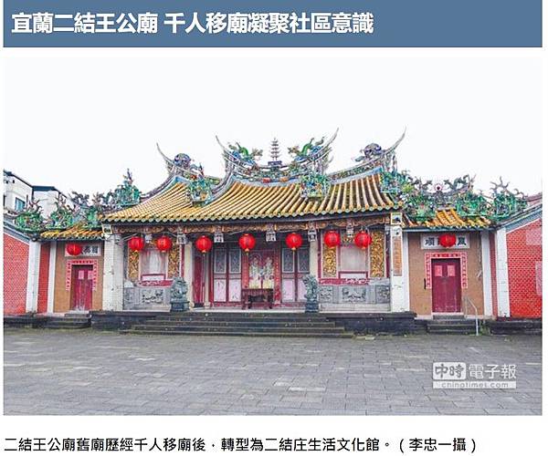 二結王公廟是宜蘭縣五結鄉重要的信仰中心,在30餘年前開始有改建之議,最後決定另建新廟,而舊廟在1997年的「千人移廟」後平移160公尺,座向從坐北朝南改為坐南朝北,新舊廟並存不僅保存文化資產,還凝聚了社區居民意識。