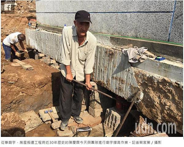 從事廟宇、房屋搬遷工程將近30年歷史的陳慶霖今天與團隊進行廟宇撐高作業。記者蔡家蓁/攝影