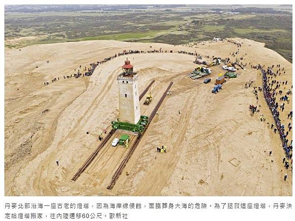遷塔作業,先在沙地上打造一條軌道,然後在燈塔基座的位置,裝置包覆式的軌道車,以每小時8公尺的極慢速度,把這座高25公尺重720噸的燈塔,往內陸遷移60公尺,費時至少10小時 逃離海岸線侵蝕 看丹麥人如何幫百年燈塔搬家 http://bit.ly/2N6Q5qV