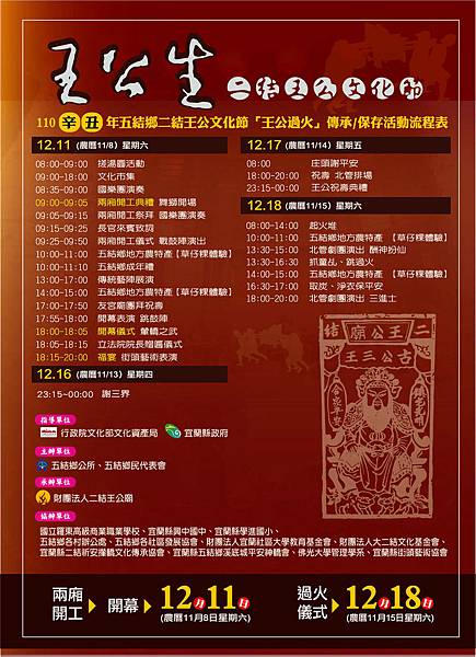 二結王公文化節活動節目表。(圖由五結鄉公所提供)全國最盛大!宜蘭二結王公過火 準備1.2萬斤木炭燒成大火堆 - 宜蘭縣 - 自由時報電子報 https://bit.ly/3pukTFi