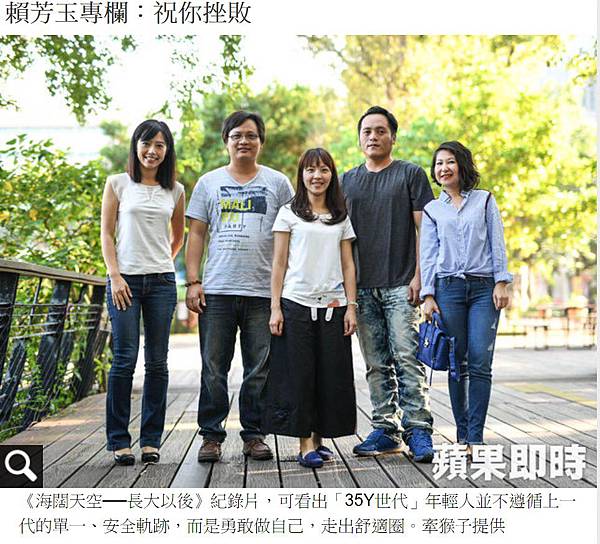 近日有部紀錄片《海闊天空──長大以後》,由《天下雜誌》拍攝,是台灣首部跨越20年拍攝成長題材的紀錄片,探討35Y世代,所謂35Y世代指的是30歲至39歲的年輕人。