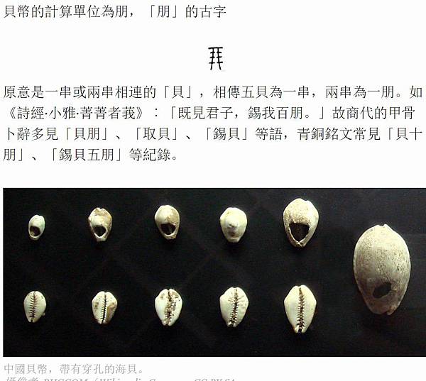 據專家考證,從出土的甲骨文及殷墟遺物中發現,殷商時期即已大量使用貝幣,有來自各地的商品,商業往來發達。如《尚書‧盤庚中》孔穎達疏︰「貝者,水蟲,古人取其甲以為貨,如今之用錢然。」大意是說,貝類是水生動物,古人拿它的殼作為貨幣,就是現在用的錢。