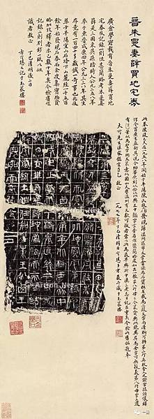 此拓的真本流傳極罕,所見多為翻刻之本,比如浙博也有一件,上有沈慈護題名,應該是沈曾植(1850—1922,浙江嘉興人。字子培,號巽齋,別號乙盫,晚號寐叟,譽稱“中國大儒”,沈慈護是其養子)舊藏,沙孟海在旁邊有詳細考證此買地券的發現始末,指出它是一件瓦券。同出土的還有瓷杯、一件白瓷獅子,以及一些腐敗的銅器等。明代的徐渭在《青藤書屋文集卷四》中有詩題云“柳元轂以所得晉太康間塚中盃及瓦券來易餘手繪二首……”可見當時有人想用此出土物來交換徐渭的兩幅畫作。比對兩件拓本,一個是明顯陶瓦質感上的刻痕,另一個無論字形上的刻劃質感還是器物表面的信息量,都不完全。沈曾植本顯然是三多本的翻刻本。
