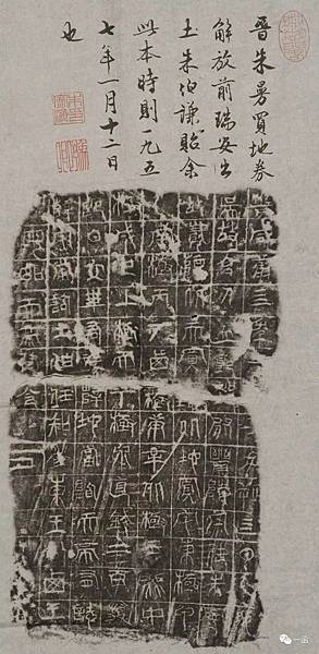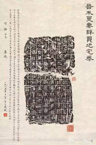 網上有一篇作者為高啟新寫於去年的文章《橫陽國寶級文物:朱曼妻薛氏買地石券》,比較詳細地考證了此碑重現人間的過程以及地券的價值,特別提到了金石大家方介堪。1930年,方介堪在上海美專任教,學生中有來自平陽的學生陳德輝,是陳錫琛之孫。方介堪問起此券,陳德輝後以新拓相贈,方介堪始知該券仍在人間。