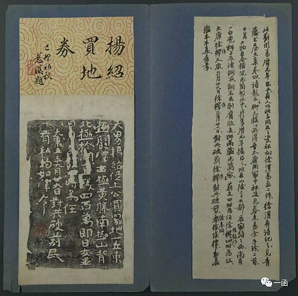浙江省博物館現在正在展出的《金石書畫》第二期裡,有一件私人藏家的東西,晉太康五年(284)刻的《楊紹買地莂》拓片真本。明萬曆年間出土於浙江會稽,三多(1871—1941,本姓鐘木依氏,漢姓張,蒙古全名三多戈,字六橋,隸蒙古正白旗,出生於浙江杭州,清朝在外蒙古的最後一屆官員之一)舊藏,寶熙(1871-1942,字瑞臣,號沉盦,室名獨醒庵。隸屬滿洲正藍旗,清朝宗室,清太祖努爾哈赤第十五子豫通親王多鐸九世孫,入民國後,任總統府顧問,後曾任偽滿州國內務處長等職)題首,後有羅振玉(1866-1940,中國現代農學的開拓者,中國近代考古學的奠基人)題跋。