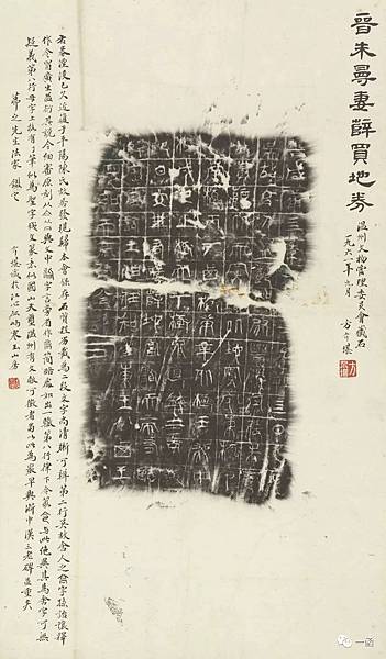 到了東晉的出土銘刻遺跡,隸書依舊是大宗而且形態開始發生變化,出現了楷書墓誌。篆書偶有所見,特別是南渡之後的篆書衰微,但餘脈猶在,像韋昶(字文休,仲將兄康字元將,涼州刺史之玄孫,官至潁川太守,散騎常侍,善古文,大篆及草)用篆書題宮室榜額,他是南渡士人,所寫“大篆”與吳地的篆體不同。藏於浙江省博物館的還有一件買地券,是東晉早期(338)的《朱曼妻買地券》,民國年間出土於浙江平陽,此地當年是東吳的腹地,其書法與東吳的《天發神讖碑》略相似,應該是江南地區流行的篆書風格。