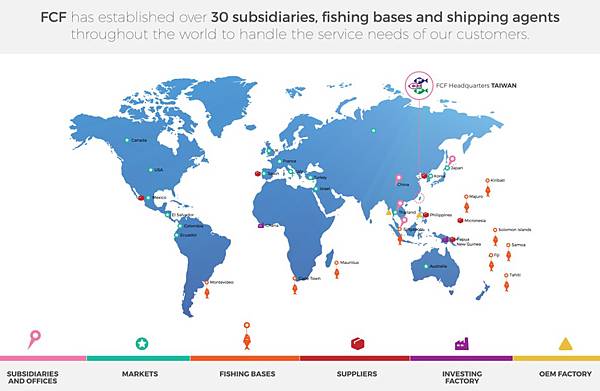 世界三大洋及其鄰近港口之漁船相關服務,並於當地設有分公司、辦事處等