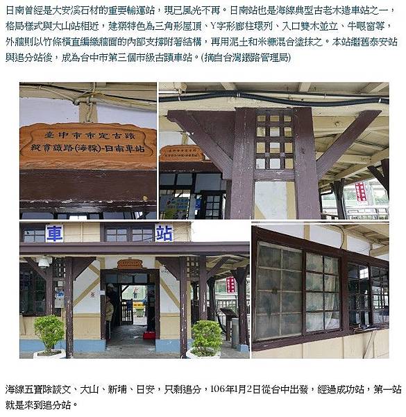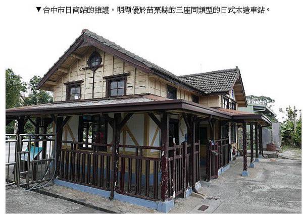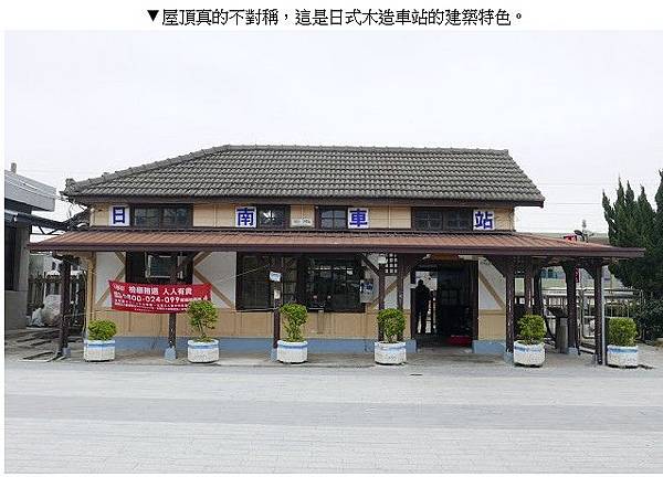 民國11年通車啟用的日南車站,與大山、談文、新埔、追分等4座車站齊名,被鐵道迷譽為「海線五寶」,皆屬洋和風型式的歇山頂建築,共同特色包括屋側的圓形牛眼窗、破風造主結構、西式木架屋簷、Y字形廊柱環列及雨淋板外牆等,是相當珍貴的鐵道文化資產。