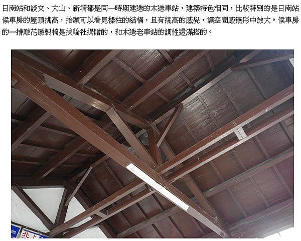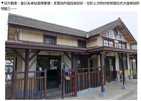 日南車站雖為日式建築,卻是英、德混合樣式,木造窗架及廊柱與當年國際流行的「藝術風」接軌,候車室用牛眼窗及四格窗裝飾,外牆以竹條編織再用泥土混合米糠、石灰砌成,屬閩南式的夯土牆,是標準的「混血車站」。