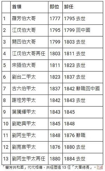 「蘭芳共和國」代代相傳,共經歷過 13 任「大唐總長」。[14]