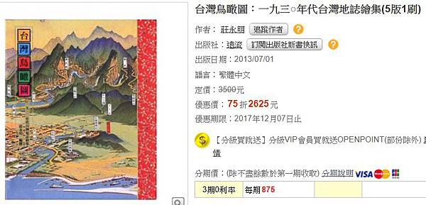 而今,很幸運的從鄭世璠、林漢章、劉峰松、陳慶豐、廖秋娥、李高雄諸人的收藏,及意圖工作室、央圖台灣分館、台北市文獻會等處, 綴足了近三十幅,乃有《台灣鳥瞰圖:一九三O年代台灣地誌繪集》這本書的撰述與出版。