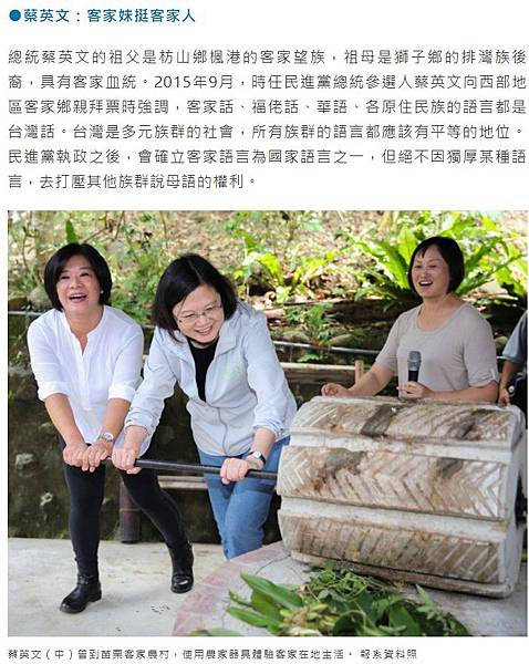 回顧過去選舉,政治人物為了搶攻客家鄉親票源,無不卯足全力提倡客家議題,而只要能和客家血統有牽連也似乎成為總統候選人必要條件,從前總統李登輝、陳水扁、馬英九到蔡英文皆是如此。結果就出現了,四任總統都是「客家人」的怪現象。