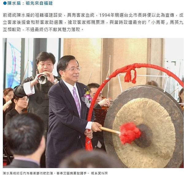 前總統陳水扁的祖籍福建詔安,具有客家血統,1994年競選台北市長時便以此為宣傳,成立客家後援會和新客家助選團,搶攻客家鄉親票源,與當時政壇最夯的「小馬哥」馬英九互相較勁,不過最終仍不敵其魅力落敗。