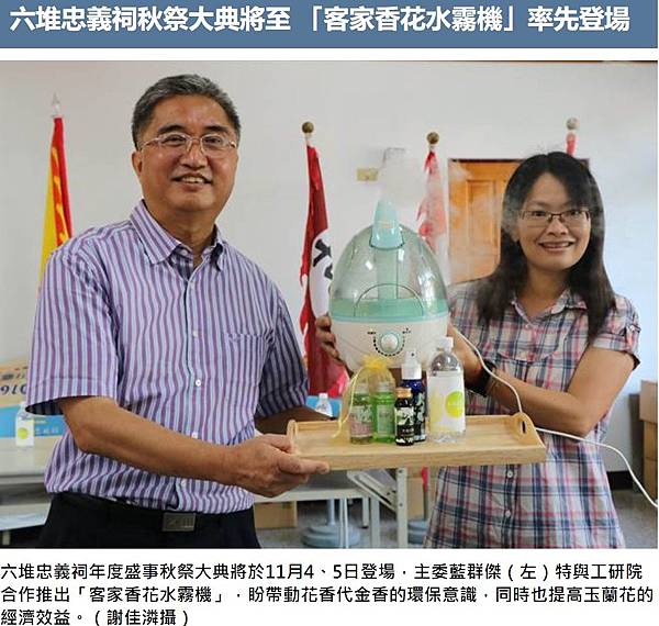 藍群傑說,當中以「客家香花水霧機」最為特別,這是忠義祠與工研院合作客家產業群聚創新推動計畫下的產品,主打「以花香代金香」,利用水霧機將客家香花純露轉化為天然香氛與負離子等物質、逸散空氣中,在敬神保佑之餘也兼具環保與創新。