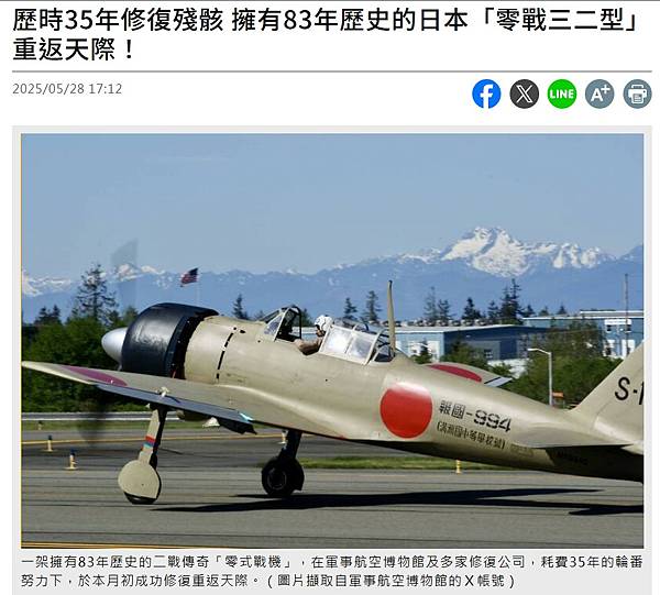 一架擁有83年歷史的二戰傳奇「零式戰機」,在軍事航空博物館及多家修復公司,耗費35年的輪番努力下,於本月初成功修復重返天際。(圖片擷取自軍事航空博物館的X帳號)