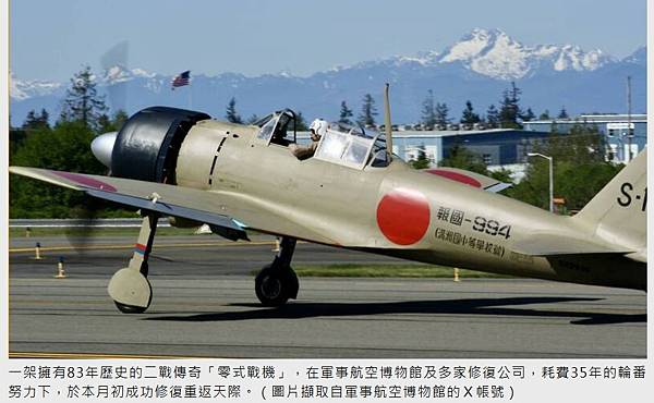 根據軍聞網站《The Aviationist》報導,在軍事航空博物館、Legend Flyers修復公司、戰機專家Brad Pilgrim及多家修復公司,耗費35年的輪番努力下,一架二戰時期的日本傳奇零式戰機,本月初在華盛頓州埃弗雷特(Everett)的佩恩飛行場(Paine Field),完成了修復後的首次試飛。這是該機自1943至1944年間在塔羅阿島被荒廢後,再度重返天際。