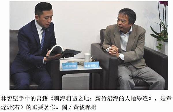 林智堅手中的書籍《與海相遇之地:新竹沿海的人地變遷》,是韋煙灶(右)的重要著作。圖/黃筱珮攝