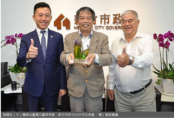 「傑出臺灣文獻獎」每3年1次選拔,新竹市今年度推薦國立師範大學地理學系教授韋煙灶,榮獲4大獎項之一「傑出文獻研究獎」,是全國僅3位的獲獎者之一。新竹市長林智堅今(1)日頒贈「竹塹之光」獎座予以表揚,感謝韋煙灶長期對新竹地區歷史地理及人文研究的貢獻。