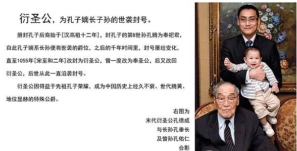 中國歷代皇朝推舉儒學,以孔子後人世襲衍聖公,以奉孔子祀。圖為中國最後一任衍聖公孔德成先生青年時照片。民國廿四年(1935),國民政府明定廢衍聖公,改為至聖先師奉祀官,是政府中唯一世襲特任官。孔氏除了是金石學研究學者,也曾任我國考試院院長。