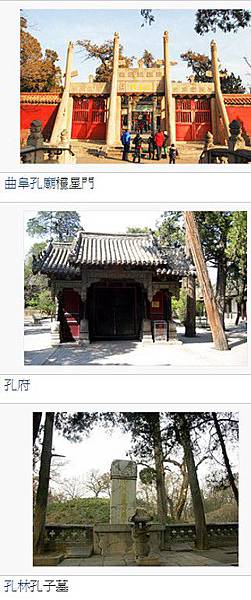 孔府 又稱“衍聖公府”,位於曲阜東華門大街1號孔廟的東側,是孔子嫡長孫居住的府第。孔府始建於宋金時期(公元12~13世紀),明洪武十年(公元1377年)建府於今址。孔府是典型的封建貴族地主庄園,佔地面積約4.9萬平方米,有各類樓房廳堂共480余間。孔府是孔子嫡孫的官署,孔子嫡孫一向以“禮門義路家規矩”相標榜,格守詩禮傳家的祖訓﹔建筑也受到儒家禮儀的制約,留下儒家宗法制度與倫理觀念的烙印。孔府沿用中國傳統的前堂后寢制度,前堂部分有官衙、東學、西學,供處理公務、會客之用,是對外活動的場所,后寢部分有內宅、花廳、一貫堂、是家族生活的場所。建筑功能分區明確、排列井然有序。建筑群設計遵循禮教與宗法原則,把一系列使用功能不同的建筑物有主次、有次序地進行排列。建筑群中貫軸線,左右對稱,成三路布局。中路為孔氏宗子衍聖公所后,東路一貫堂為次子所居,居中為尊。體現了宗子的尊貴地位和宗子與非宗子等級與地位的差別。中路官衙、內宅界限分明,體現了男女授受不親,內處有別。軸線上。正房與廂房,中門與邊門,體現了主人與下人的尊卑差別。建筑物的名字也打著儒家思想的印記,“一貫堂”、“忠恕堂”、“安懷堂”等既贊揚孔子的忠怨思想和使人安樂的政治理想,又顯示孔子嫡孫努力仿效的決心,“東學”、“西學”,既贊揚孔子創學設教的功績,又表明孔子嫡孫繼承詩禮傳家、好學重教傳統的態度。