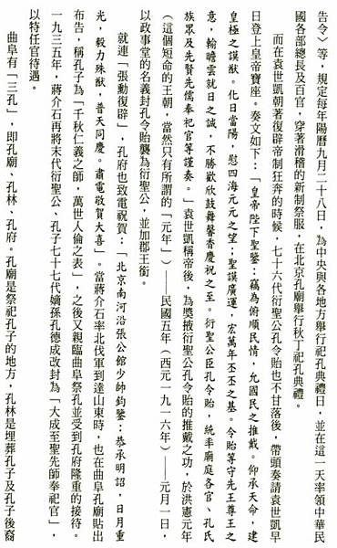 袁世凱所定《崇聖典例》 大總統令: 茲制定《崇聖典例》,公佈之。此令。中華民國三年二月二十曰教令第二十二曰 國務總理孫寶琦、內務總長朱啟鈐 《崇聖典例》 第一章 世爵 第一條 衍聖公膺受前代榮典,均仍其舊。其公爵按舊制由宗子達襲,報經地方行政長官呈有內務部核請承襲。第二條 衍聖公俸,依公爵舊制,俸額酌定為歲俸銀幣二千元。第三條 衍聖公印,由國務院飭印鑄局用銀質鑄造頒給,文曰:“衍聖公印”。其舊有三台銀印,交由內務部保存。第二章 世職 第四條 聖賢後裔舊有五經博士等世職,茲均改為奉祀官,世襲,主祀;其舊設奉祀生裁撤之。奉祀官按舊設額置如左: 一 至聖後裔世襲奉祀官八員; 二 先賢先儒後裔世襲奉祀官二十名:先賢東野氏、顏氏、曾氏、孟氏、閔氏、冉氏耕、冉氏雍、端木氏、仲氏、言氏、卜氏、顓孫氏、有氏、朱氏、周子敦頤、程子顥、程子頤、邵子雍、張子載,先儒韓子癒後裔,世襲封祀官各一員。前項至聖、〈先〉賢、先儒後裔世職,由衍聖公及各氏按照舊例,