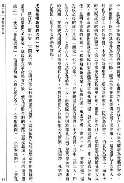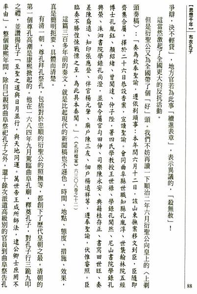 想想大明朝老朱家待他們“聖裔”,實在是不薄呵!當年朱元璋稱帝伊始,就賜給孔府祭田兩千大頃(合六十萬市畝),並配撥耕種祭田的大量佃戶。朱元璋還讓孔府衍聖公位列朝班文臣之首,又特賜龍頭藤杖給孔氏族長,令其“主理家政”。崇禎時衍聖公孔衍植晉封為太子太保、太子太傅。……可以說,明王朝對孔府“聖裔”真正是優禮有加,皇恩浩蕩。我們且不說什麼“民族氣節”,不要求“聖裔”們效法顧炎武、史可法、劉宗周、張煌言等抗清志士;單以“ 知恩圖報 ”的舊道德而言,“聖裔”們對剛剛覆亡的舊朝也理應深懷哀念,至少不必那麼急不可待,搶在“第一時間”向“ 新朝 ”進表獻忠吧。尤其具諷刺意味的是,急切進表的衍聖公,就是“舊朝”的太子太保、太子太傅孔衍植。