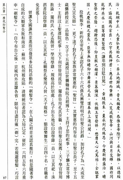 投桃報李,孔府的獻忠“進表”極快得到了回報——九月初四日,清廷就下旨:“先聖為萬世道統之宗,禮當崇祀,昭朝廷尊師重道之意。”恩准孔府聖裔仍將享有既有的一切優渥特權。“新朝”順治帝福臨當時只有六歲,因此,這個優禮孔府的聖旨,其實是攝政王多爾袞和降清的範文程等大臣深思熟慮之後作出的。