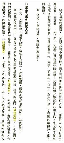 初進表文:順治元年九月初一日上。伏以泰運初享,萬國仰維新之治,乾綱中正,九重弘更始之仁。率土歸城,普天稱慶。恭惟皇帝陛下,承天禦極,以德綏民。協瑞圖而首出,六宇共戴神君;應名世而肇興,八荒咸歌聖帝。山河與日月交輝;國祚同乾坤共永。臣等闕里豎儒,章縫微末,曩承列代殊恩,今慶新朝盛治。瞻聖學之崇隆,趨蹌恐後;仰皇猷之赫濯,景慕彌深。伏願玉質發祥,懋膺天心之篤祜;全甌鞏固,式慶社稷之靈長。臣等無任瞻仰汴舞屏營業員之至。謹奉表上進以聞。(《孔府檔案》六三O八卷之一)