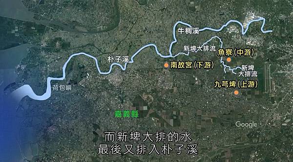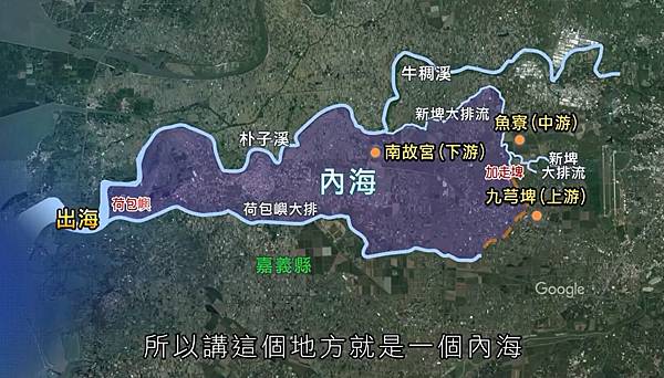 在高速公路往西,有好幾條水圳都往那個地方,然後終結到末端有一個,新埤大排,那新埤大排的水匯流到牛稠溪,也就是朴子溪,那這一邊是往南到加走埤然後延伸到荷包嶼,那兩個在末段,到出海口,又匯合,所以講這個地方就是一個內海,所以把故宮設在這個地方是不對的是在一個河口。