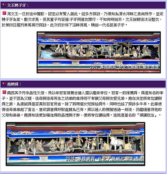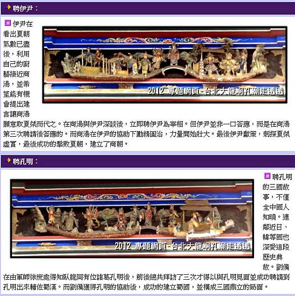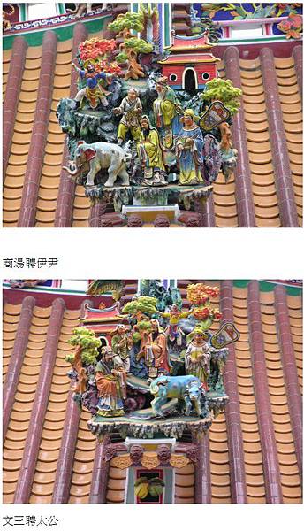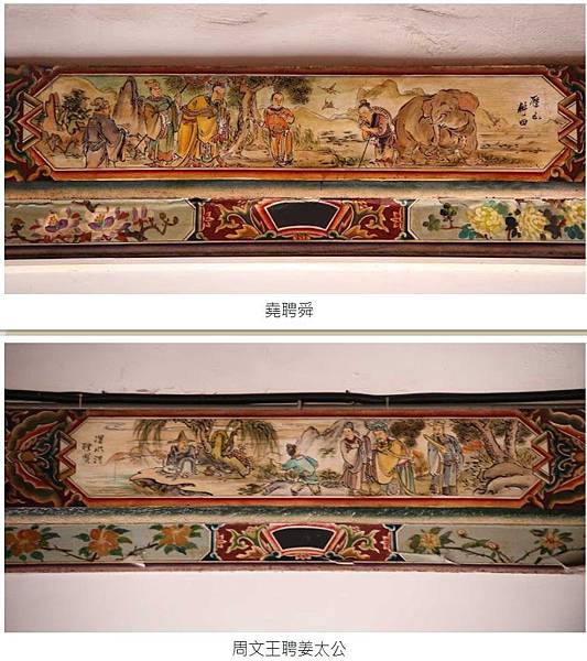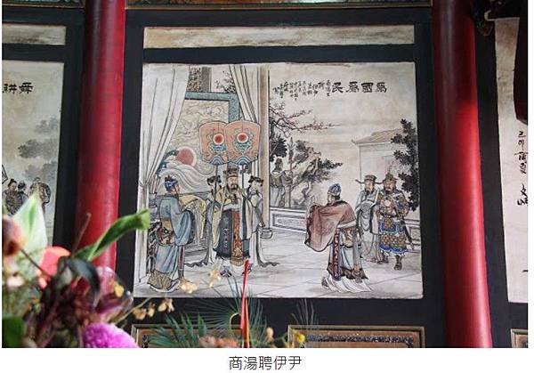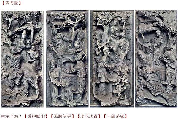 在廟宇裝飾藝術中,常會引用一些教化人心的故事作為裝飾,「四聘」的故事就是在寺廟裝飾上常見的題材。四聘是指歷史上四個放下身段聘請賢才的故事,一般都採用:「舜耕歷山(堯聘舜)、為國為民(商湯聘伊尹)、渭水聘賢(周文王聘姜太公)、三顧茅廬(劉備聘諸葛孔明)」,這些故事主要是描寫傳統社會尊重賢能之士的社會價值,提醒治理國家的人,以仁愛的心愛護他的人民,並善用人才。「四聘」也寓涵在上位者當有謙虛的心,禮賢下士,國家才能欣欣向榮。