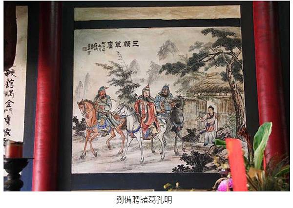 又稱「三顧茅廬」。《三國演義第三十七回》:曹操囚徐庶母,要徐庶離開劉備歸曹營,徐庶不得以而離開,並向劉備推薦諸葛亮出來輔佐蜀漢,說他有經天緯地之才,出鬼入神之計,何愁天下不定。又得司馬徽將諸葛亮比喻為姜子牙及張良之才,更堅定求諸葛亮輔佐之心,準備禮物往南陽臥龍岡隆中謁諸葛亮,經三次往訪,才遇見諸葛亮,期間引起關羽、張飛的不快,但劉備的禮聘敦請,終得諸葛亮的輔佐而三分天下,備死,諸葛亮臨危受命,力輔後主,六出祁山,鞠躬盡瘁,死而後已,讓蜀漢延續國祚四十六年。另外聘賢有神農拜常桑、軒轅拜老彭、黃帝拜風后等聘賢佐政,使國康民阜,傳為為政者佳話。看見四聘圖,應當思考今天為政者是否賢明,能聘賢佐政。