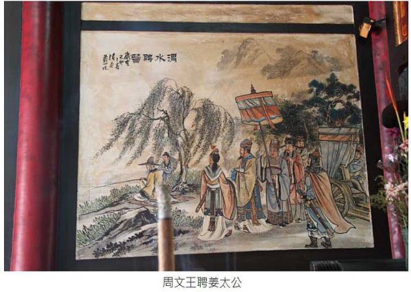 渭水訪賢:姜子牙棄朝歌,隱於磻溪,垂釣渭水,魚鉤直而不曲,有樵夫問之,子牙答曰:「老夫在此名雖垂釣,我自意不在魚…吾寧在直中取,不向曲中求,不為錦麟設,只釣王與侯。」終待得文王齋戒沐浴前來拜請為相,時子牙已年近八十。