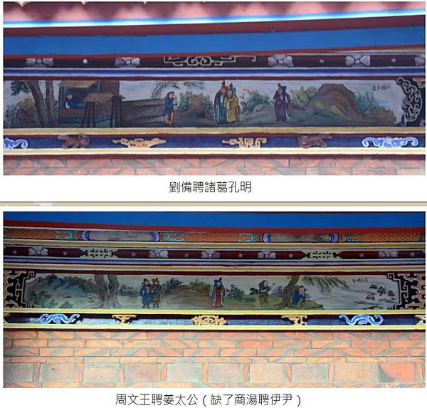彩繪是最能說明故事細節的表現方式。位於鹿港龍山寺旁邊的金門館原來是同鄉會館,也是水師會館,左右廂房提供鄉親及水師官兵借宿使用,因此內裝樸實,「四聘」的彩繪位於正殿兩側。
