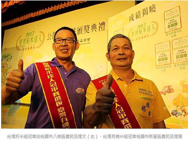 2017台灣稻米達人冠軍出爐,台灣好米組冠軍由桃園市八德區農民呂理文獲得;台灣有機米組冠軍則由桃園市新屋區農民呂理陽獲得,巧合的是兩位竟然是堂兄弟,且都以桃園三號獲獎。另外,年僅18歲的新竹縣新竹市農民陳成禮,今年首次參賽便獲得台灣好米組季軍的佳績。