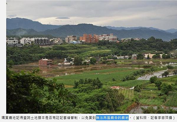 別以為買了二分半農地就可以蓋農舍。高雄美濃羅姓農民廿年前買農地,近日申請興建農舍被打回票,原因是過去可用「未毗鄰農地」合併計算建蔽率,他買下的部分農地,已被前地主「借去蓋房子」,土地謄本註記「套繪管制」,不能再蓋農舍。