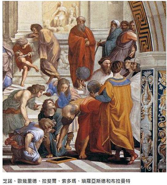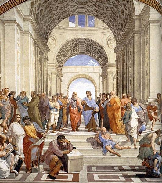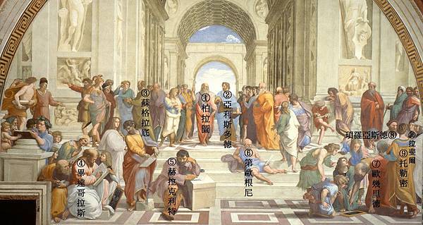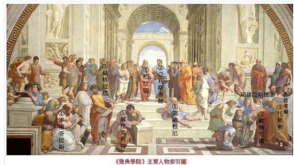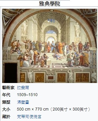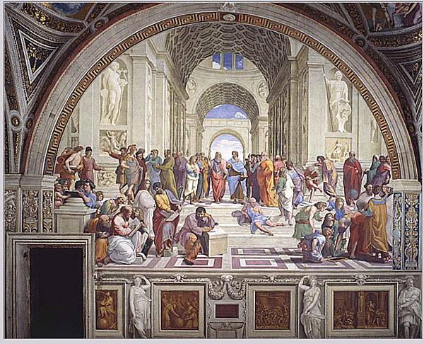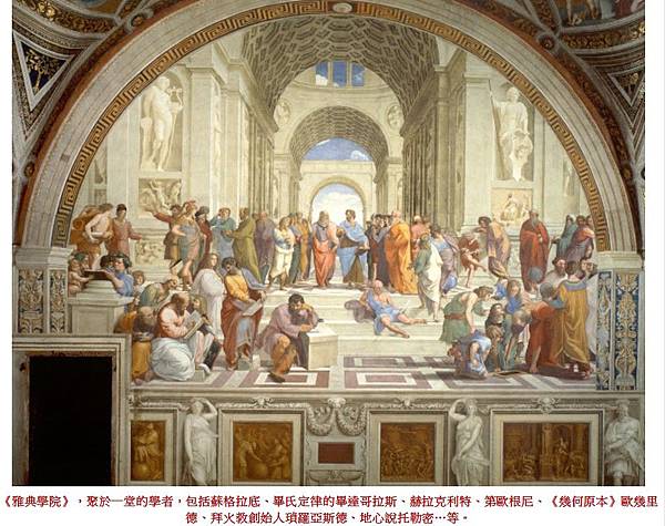 這幅《雅典學院》(1510~1511年作),是以古希臘哲學家柏拉圖所建的雅典學院為題,以古代七種自由藝術——即語法、修辭、邏輯、數學、幾何、音樂、天文為基礎,以表彰人類對智慧和真理的追求。