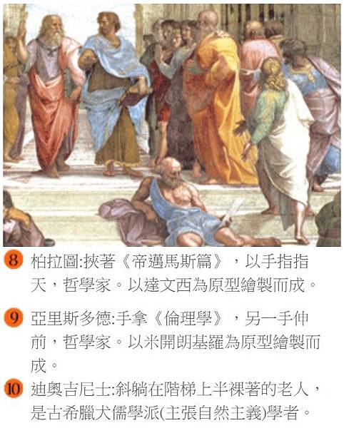 關於赫拉克利特這圖,似乎我們把一幅美術作品,講成了哲學課,失去了藝術美的即視感,這是我的錯,但本帖的主題即說明——《雅典學院》人物的深度解析。深度也許未必,但解析卻是必須的——或許聒噪。