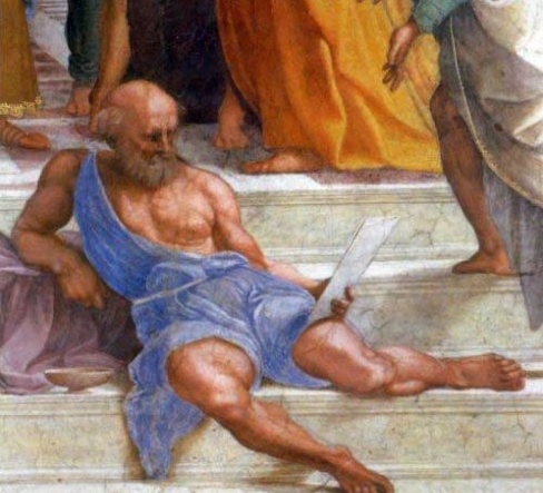 把自己畫進歷史題材內,是當時畫家們喜用的表現方式,只是拉斐爾留給自己的位置太少了點。畫中央的台階上,躺著一個孤寂的犬儒學派哲學家第歐根尼。這位學者主張除了自然需要之外,其他任何東西,包括社會生活和文化生活都是無足輕重的,所以他平時只穿一身破爛衣服,住在一隻木箱裡。這個人物在構圖上起了填補空白的作用,他與右側正往台階上走去的兩個人物相聯繫,同時又與左下角那個倚靠在石桌前沉思的學者赫拉克里特彼此呼應。赫拉克里特形象孤單,被認為是拉斐爾雖然與米開朗基羅性格不合,但崇尚他的作品才以其為範本創作的。