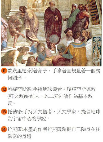 這四個人似乎對老師的講解領悟得不一樣。旁邊那個身穿古代黃袍、頭戴榮譽冠冕、手持天文儀的,是埃及天文學家爾托勒密。在爾托勒密的對面,即是畫家拉斐爾的同鄉、建築家布拉曼特(蓄須的老人),而最邊上那個頭戴白帽的人,正是畫家索多瑪,上面露出半個腦袋、頭戴深色圓形軟帽的青年,就是畫家拉斐本人。