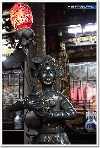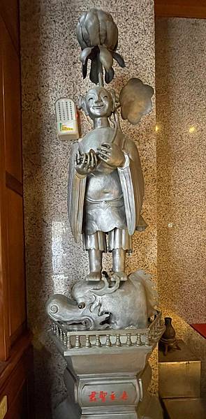 慈聖宮的錫人燈也是大正九年所製造,不過樣態為一笑容開懷的童子,身著大袍、張袒胸肚,手持元寶、荷花,頗有之意。而其腳踩鰲首,則是配合媽祖的海神神祇。