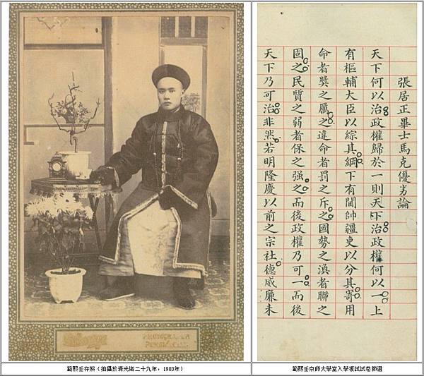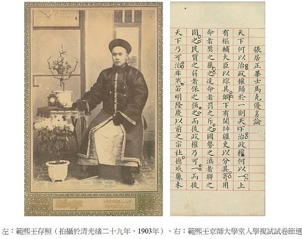 左:範熙壬存照(拍攝於清光緒二十九年,1903年),右:範熙壬京師大學堂入學複試試卷節選