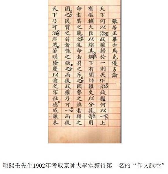 範熙壬先生1902年考取京師大學堂獲得第一名的“作文試卷”