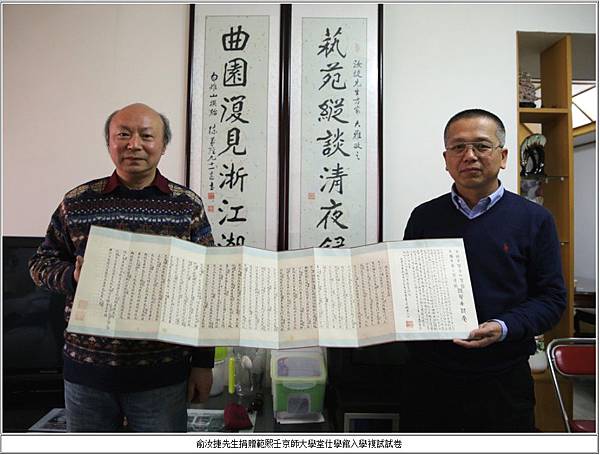 湖北省社科院研究員俞汝捷(左)將試卷捐贈給北京大學校史館、檔案館館長馬建鈞(右)