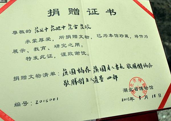 5月18日上午,武漢黃陂籍台胞台屬范延中、范回中兄弟一行,捐贈辛亥志士范熙壬、范軾的四部手書遺稿,以及作家裴高才著《為民喉舌˙范熙壬傳》捐贈儀式,在湖北省博物館舉行。其中范熙壬代表國會起草的弔唁孫中山祭文,是研究中國近現代史及辛亥革命史難得的孤本。
