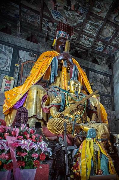 金頂殿內的真武神像披髮跣足,在金童玉女左右侍衛的簇擁下安然坐在御椅上,大小如同真人,和藹可親。「天人合一」在這裡得到最完美的結合。