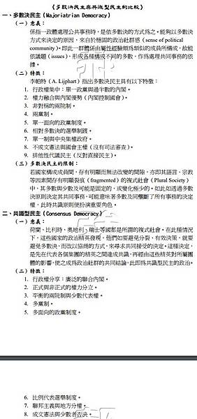 3.共識民主:又稱協和式民主。複式社會(Plural society),ex.荷、比,由於宗教、語言或意識形態之差異,為了避免分裂,有效決策要避免多數決,改以協商方式尋求共同接受的決定,這種決定先在代表各集團之菁英達成,再由菁英所屬團體之影響,使之成政治社群之共同結論。政治精英以協商代替多數決。97身心