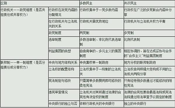 (1).多數民主與共識民主:多數民主模式的本質在於“政府由多數人控制並符合多數人的願望”,是一種“排他性的、競爭性的、對抗性的”民主;共識民主模式雖然也承認多數人的統治優於少數人的統治,但僅僅把多數原則視為最低限度的要求,它的核心在於讓盡可能多的人參與到政府中來,“努力使'多數'的規模最大化,而不是滿足於獲得做出決策所需的狹隘多數”,是一種以包容、交易和妥協為總體特徵的民主。共識原則能夠實現民主的範圍和程度的最大化;而多數原則往往使政治權力集中在較為狹隘的多數人手中,並且容易引起對抗和衝突。