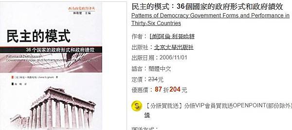 對於上述諸多根台灣政治亂象的源,我們都可以參考長期研究民主政體類型的知名學者李帕特於1999年出版的這本《民主類型》。