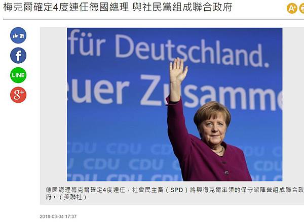 分享梅克爾確定4度連任德國總理 與社民黨組成聯合政府到Facebook 分享梅克爾確定4度連任德國總理 與社民黨組成聯合政府到Line 分享梅克爾確定4度連任德國總理 與社民黨組成聯合政府到Google+