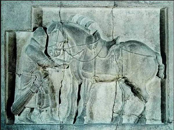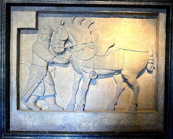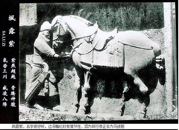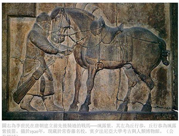 圖右為李世民在唐朝建立前先後騎過的戰馬──颯露紫,其左為丘行恭,丘行恭為颯露紫拔箭。攝於1920年,現藏於常春藤名校,賓夕法尼亞大學考古與人類博物館。(公有領域)